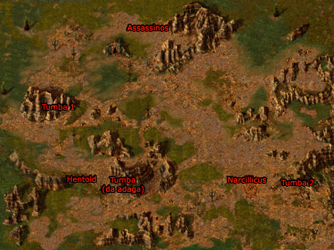 Missões: Um pouco ao sul do centro da área você encontrará um ladrão de tumbas chamado Hentold. Parece que ele roubou uma adaga de uma tumba e desde então ele vem sendo perseguido pelo antigo dono dela! Ele lhe dá a adaga para que você a devolva à criatura que o está perseguindo. Vá um pouco para o leste para alcançar a caverna, entre e a criatura irá pedir sua adaga de volta. Quando ela a tiver, ela irá morrer. Você ganhará 900xp pelo trabalho. Contudo, você pode simplesmente matar a criatura, ganhar 3000xp e ainda por cima ficar com a adaga. Você também pode saquear a caverna. Só porque a última pessoa que tentou ficou amaldiçoada, não significa que você também irá ficar!