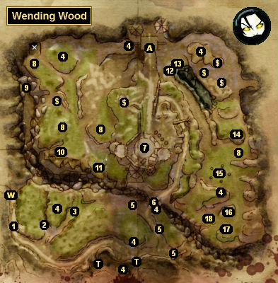 1) Caravana Arruinada: Se você pilhar os contêineres próximos a caravana, você encontrará dois conjuntos de Sedas Finas (as quais você precisará para a missão “Bens dos Comerciantes”). 2) Acampamento do Catador: Quando você se aproximar deste acampamento, você será atacado por meia dúzia de catadores. Após a batalha, você encontrará algumas Sedas Finas num barril e um pergaminho repousando num engradado. Você precisará das sedas para a missão “Bens dos Comerciantes”. O pergaminho lhe dará a entrada do códice Notas para Ordens da Milícia. 3) Acampamento do Catador: Quando você se aproximar deste acampamento, você será atacado por mais catadores, além de alguns silvanos. Quando você pilhar o acampamento e os cadáveres, você encontrará três conjuntos de Sedas Finas (as quais você precisará para a missão “Bens dos Comerciantes”). 4) Estátua Gravada: Você precisará pegar as gravuras desta estátua para a missão “Monumentos de Maferath”. Sempre que você o fizer, você ganhará ou atualizará a entrada do códice Livros e Canções para O Cântico de Maferath. 5) Carrinhos Derrubados: Nos contêineres próximos a esses carrinhos você encontrará três conjuntos de Sedas Finas (as quais você precisará para a missão “Bens dos Comerciantes”). 6) Ponte: Quando você passar pela ponte, você encontrará Velanna, a elfa que tem atacado as caravanas. Este encontro está detalhado na missão “Problemas no Comércio”. 7) Acampamento Valelfo Abandonado: Num engradado do acampamento você encontrará uma Prece Élfica Para os Mortos. 8) Silvanos Antigos: Você encontrará silvanos antigos nestes quatro lugares. Você precisará matá-los para a missão “Da Floresta Viva”. 9) Lobos do Flagelo: Você encontrará vários lobos do flagelo aqui, incluindo um lobo do flagelo alfa “amarelo”. 10) Sobrevivente da Milícia: O sobrevivente da milícia está envolvido na missão “Problemas no Comércio”. 11) Emboscada da Aranha: Quando você chegar a este local, você será emboscado por diversas aranhas gigantes e aranhas venenosas. Após a batalha, você encontrará o anel Cinza no cadáver da prole das trevas. 12) Cadáver do Sábio: No cadáver do sábio você encontrará uma Pedra Estranha e um Diário Gasto. Pilhar tais objetos lhe dará a entrada do códice Relaciona a Missão para Um Diário do Sábio. Você precisará da pedra e do diário para resolver o enigma da pedra (%15). 13) Depósito de Granito: O depósito de granito está envolvido na missão “O que é Erguido Dura”. 14) Estátua da Paz / Estátua da Guerra: Quando você se aproximar das estátuas, a Estátua da Guerra falará com você e lhe dará a missão “Irmãos de Pedra”. Ele lhe dirá que ele e seu irmão foram amaldiçoados por um mago Tevinteriano mil anos atrás, e lhe pedirá para convocar o mago perturbando seus ossos (localizados ao norte), e então derrota-lo em batalha. Após o diálogo, a Estátua da Paz lhe fará uma contraproposta. Ele te informará que as suas meditações o revelaram que “violência sempre resulta em nada”, e lhe pedirá para ensinar sua lição ao seu irmão. Se você ficar do lado da Estátua da Guerra, você terá de lutar contra o magistral antigo “vermelho”, mas quando você retornar a estátua, ele te recompensará com A Lâmina do Inverno. Se você ficar do lado da Estátua da Paz, você precisará conversar com a Estátua da Guerra novamente, mas depois, quando você retornar a Estátua da Paz, você receberá receitas para Devorador de Vigor Potente, Devorador de Vigor Superior, e Bálsamo de Espírito Maior. De qualquer forma, você receberá 750 pontos de experiência. Nota: Se você ficar do lado da Estátua da Paz, após completar a missão você ainda será capaz de convocar o magistral antigo – e coletar objetos e experiência extras quando matá-lo. 15) Enigma da Pedra: Se você pilhar o cadáver do sábio ao norte (#12), você descobrirá que o objetivo deste enigma é fazer um caminho de fogo que se conecta a todas as pedras numa única laçada. Uma solução para o enigma está demonstrada na inserção abaixo. Se você resolver o enigma, então um baú místico aparecerá no centro, e dele você será capaz de pilhar o amuleto Iluminação. Você também receberá 800 pontos de experiência.