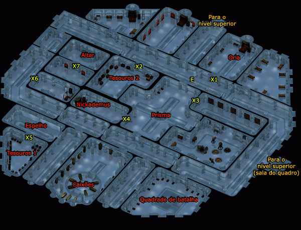 X são as portas para as quais você precisa usar um método especial para abrir. Nós começaremos aqui com o PRISMA no meio da área. Para ajustar o prisma, puxe a alavanca inferior (x 2029 y 1183); para atirar com o prisma, puxe a alavanca superior (x 2068 y1131). Se você por acaso quebrá-lo, você pode repará-lo usando as chaves na sala do quadrado de batalha. Aponte o prisma para o nordeste para abrir X2. A sala contém alguns pergaminhos mágicos. Aponte o prisma para o sudoeste para abrir X3. Você encontrará Nickademus dormindo. Tocar e APENAS tocar o criado-mudo perto dele o acordará. Quando você pedir a ajuda dele, ele exigirá que você faça um favor a ele no futuro e é claro que você terá que aceitar. Agora, você tem uma opção: 1) Pedir ajuda para vencer Aiej-Kllenzr't - Ele dará a você algumas proteções/aprimoramentos. Eu sugiro pegar a experiência porque Aiej é simples de vencer e os objetos que ele lhe dá na verdade são os do criado-mudo. Não tente destrancar o criado-mudo dele neste ponto. Se você o fizer ele ficará hostil. Caso você o mate, o jogo termina. Você pode pegar os objetos quando estiver prestes a deixar o templo para sempre. Além disso, você pode conseguir muitas informações sobre o templo com ele, já que ele é o arquiteto deste lugar. A sala dos caixões é uma sala cheia de caixões e sombras. Um dos caixões na extremidade noroeste pode ser aberto. É claro que você tem que abri-lo. A sala dos espelhos é uma sala com dois espelhos na parede nordeste que contém talisman henchmen. Quando você tocar os outros dois espelhos no noroeste e quebrá-los, estas pessoas serão libertadas e o atacarão. Agora aponte o prisma para o sul; a luz irá para a sala dos caixões, sofrerá alguns desvios, passará pelo caixão aberto, acertará o espelho na sala dos espelhos e quebrará a porta X5. A sala dos tesouros 1 é onde você encontrará um dos dois objetos de Nathaniel, um saco com o nome dele. Não volte até ele ainda, você pode perder uma missão secundária. Agora nós brincaremos com a escadaria do quadro falante (acesse-a através da escadaria para o nível superior). Fale com o quadro como você falaria com um NPC normal. Você terá várias opções. Cada resposta diferente mudará o destino da escadaria. Abaixo estão as opções e seus destinos: 1: Death to Kuldahar. 2: Lysan. 3: Auril shower me with strength. 4: In Auril's name... 5: Bedroom. 6: From the sea of moving ice... Na antesala do altar - você chega aqui através da escadaria do quadro falante - envie alguém para perto da porta X7 para sofrer dano, para então você conseguir abrir a porta X6. Aponte o espelho E para a esquerda. Agora aponte o prisma para o norte e use-o. O raio sofrerá vários desvios e eventualmente acertará a porta X7, abrindo-a. Mande um personagem com DEX alta na sala. O altar falará com você, escolha a resposta com o nome "The Caged Fury". A porta X7 vai fechar e o altar o atacará com um whirlwind que seu personagem de DEX alta não terá problema algum em evitar. Quando a porta reabrir, inimigos virão do norte e do sul da porta X6 para atacá-lo. Quando você terminar com eles, fale com Xhaan para receber sua recompensa. Na sala do quadrado de batalha você encontrará muitas alavancas. As três no sudoeste da sala são, da inferior para superior, ativador, seletor 1 e seletor 2. Quando uma alavanca está de pé ela está ligada, quando está deitada, desligada. . 1 desligado, 2 desligado: Inicia quadrado de batalha; Jogue o quadrado de batalha e vença uma linha de três quadrados para obter a chave para a sala de Oria (porta X1). Ela estará acompanhada de dezenas de winter wolves. Quando ela sofrer uma certa quantidade de dano, ela ameaçará quebrar o cajado dela e desaparecerá. Momentos depois ela aparecerá do nada e lhe atacará novamente. Agora você não consegue mais causar dano a ela não importa o que você faça. Corra rápido para o quarto do Nickademus e peça um conselho a ele. Agora que você sabe o que precisa fazer, corra para a sala do quadrado e ligue o modo inner sanctum. Quando ela morrer, lembre-se de desativá-lo. Depois de Oria ser derrotada, você pode ir para a segunda sala de tesouros através da escadaria do quadro falante. Nela você encontrará outro objeto de Nathaniel, Ring of Vorn. Você pode escolher se devolve ou não este anel para ele. Para mim, o anel não é tão bom assim, portanto eu prefiro pegar a experiência. Quando você retornar os dois objetos para ele, ele irá embora. Quando ele sair, Oswald também o fará, portanto se você deseja falar com Oswald, vá logo.