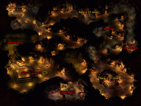 Depois de cuidar dos inimigos aqui, vá para o leste a partir da entrada. Você passará por uma área com um grande número de aranhas que leva ao sul, mas esta não é a área que queremos. Mande um ladrão continuar para o leste até você chegar ao final e o caminho virar para o sul. Enquanto você caminha, uma pedra enorme irá rolar em sua direção, corra e no final você vai encontrar o corpo de Mandal. Em um baú perto do corpo há uma armadura leve amaldiçoada. Mesmo amaldiçoada, é a melhor armadura leve para um ladrão. Volte e fale com Nheero sobre o que você achou e ele irá pedir para você achar a lâmina de Mandal para que ele possa dormir em paz. De volta ao segundo nível e a partir da entrada, nós iremos para o oeste. Você chegará em uma escada com armadilhas e no final desta sala, a oeste, você verá algumas cascas de ovos. Continue para o sul, passe a ponte com armadilhas e vá para o oeste até você chegar no Nathaniel dentro de um tipo de oásis. Ele oferece cura de graça e comércio. Além disso, se você encontrar algum prisoneiro, você pode dizer a eles para ir ao oásis de Nathaniel. Você pode voltar até os prisoneiros que você libertou no arsenal e dizer a eles isso. Eu não sei por que meu personagem mencionou a geleira a ele como se fosse a primeira vez que nós nos encontramos desde que nos separamos na geleiras. Já que nós encontramos ele na passagem de Kuldahar, não deviamos mencionar isso? De qualquer maneira, esse Nathaniel é falso. Um rakshasa disfarçado. A essa altura se você voltar a Kuldahar e falar com o Nathaniel verdadeiro, você pode expor este Nathaniel falso. Essa é uma luta complicada por uma razão, você terá pela frente um número de jaguares praticamente infinito, já que quando você mata um jaguar outro aparece. E quando o jaguar aparece ele sempre aparece no lugar que você menos queria. Geralmente no final, seu guerreiro vai estar cercado por jaguares e sem chance nenhuma de ele sair ou de um clérigo chegar perto para curá-lo. Continuando sul a partir do oásis de Nathaniel, você irá chegar em um grande altar piramidal e uma figura de cobra no chão com uma armadilha que é impossivel de ser desarmada. Continue sudeste daqui e você irá encontrar uma sala com um laboratório de alquimista e uma biblioteca. Esse laboratório tem um papel importante no jogo. Mas por hora você pode saquear tudo o que você achar aqui. Você irá encontrar uma mandrake root (raiz de mandrake) em uma das mesas. Marque essa mesa e fique com a raiz. Você também encontrará uma nota do laboratório. Estude ela pois ela contém informação vital sobre como o laboratório funciona. Volte até a entrada, e vá para o leste. Lembra do caminho infestado de aranhas? Vá para o sul por ele e você chegará na saída. Essa saída tem uma armadilha que solta lanças em você e teleporta uma feiticeira yuan-ti para lutar com você. Você vai precisar desarmar a armadilha, senão toda vez que você passar aqui você vai ativá-la. |