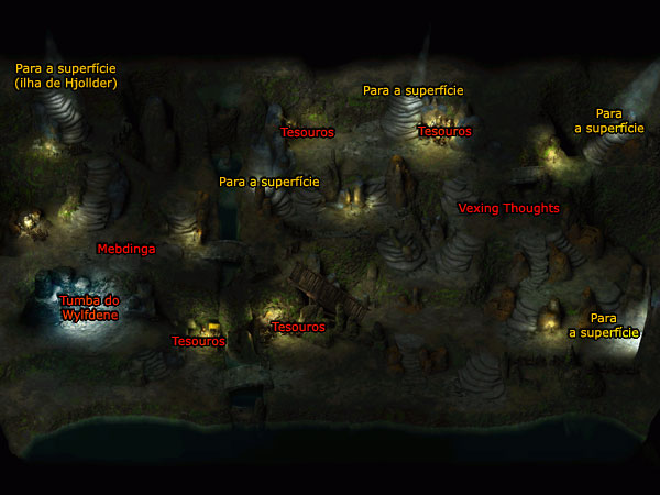 Há mais barrow wights lá dentro. A entrada que nós usamos (há cinco entradas para essa tumba na superfície) nos leva ao centro da caverna. Vá para cima para encontrar três recipientes cheios de tesouros (o maior no meio tem uma armadilha) (x 1725 y 750). Da esquerda para a direita: Recipiente 1: Recipiente 2: Recipiente 3: Vá para a direita para encontrar mais barrow wights e três recipientes com tesouros (x 2545 y 760). Da esquerda para a direita de novo: Recipiente 1 (armadilha): Recipiente 2 (armadilha): Recipiente 3: Desça as escadas aqui, então vá para a direita (x 2828 y 1310). Você verá Vexing Thoughts aqui então fale com ele. Você descobre que ele é um demônio que está trancado dentro de uma armadura porque seu mestre esqueceu o verdadeiro nome dele. Quando você descobrir o nome volte até ele e diga que ele será comandado. Use o verdadeiro nome e você consegue a armadura em que ele está trancado (junto com ele): . Vexed Armor (AC 1, 100% resistência a gelo, CON +2, firestorm 1x/dia, pode invocar Chalimandren, o Glabrezu); Se você conseguir a armadura usando um método diferente, ela não ficará tão boa. Quer seja o que você faça, NÃO INSISTA EM USAR A ARMADURA! Isso resulta na morte instantânea de quem a usar. Depois que fizer isso (ou não, depende do fato de você ter o feitiço contact other plane ou não) desça denovo até você encontrar mais alguns mortos-vivos. Dessa vez você também deve destruir algumas wailing virgins. Elas parecem lutar como bardos, cantando músicas que ou ajudam seus aliados ou prejudicam seus inimigos. Daí (x 3040 y 1985), vá para a esquerda, atravesse a ponte e cuide dos drowned dead (x 1050 y 1440). Eu acho esses inimigos muito irritantes, especialmente com as amigas wailing virgins que eles têm. Siga para a esquerda para encontrar mais alguns tesouros (x 235 y 1366). Há dois recipientes com armadilhas aqui. Da esquerda para a direita: Recipiente 1: Recipiente 2: Vá para a esquerda até o canto da tela, e para baixo até Mebdinga falar com você. Você deve conseguir alguma informação sobre Wylfdene com ela. Ela não escutará você por muito tempo e vai atacar com algumas wailing virgins. Essa foi uma batalha meio difícil já que Mebdinga e os amigos dela podem causar um dano quase contínuo em meu grupo. De uma olhada na tumba aqui (x 450 y 1800) que contém alguns tesouros: . 735gp; Vá para a direita. Deve haver alguns mortos-vivos no seu caminho (como se você precisasse de mais). Mate-os (denovo) e continue indo para a direita até o próxima local com tesouros (x 1240 y 1950). Há três recipientes. Da esquerda para a direita: Recipiente 1: Recipiente 2 (armadilha): Recipiente 3 (armadilha): Siga para direita e atravesse a pequena ponte. Depois de cuidar dos drowned dead, barrow wights e wailing virgins, aqui você pode checar os tesouros em (x 1530 y 2000) e (x 1730 y 1940). Recipiente 1: Recipiente 2: Se você for mais para a direita, você pode encontrar mais mortos-vivos para matar, nada de mais. Se você gosta de matar coisas que já estão mortas vá para lá. Nós já fizemos tudo que tínhamos pra fazer aqui, você pode voltar para a superfície. Há 5 saídas para a superfície, mas nós só precisamos usar uma delas. Vá para a direita, e então para cima e vá para a saída em (x 300 y 560).