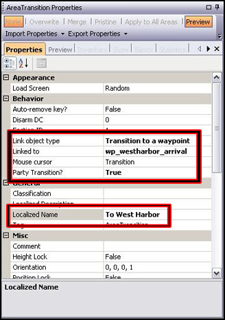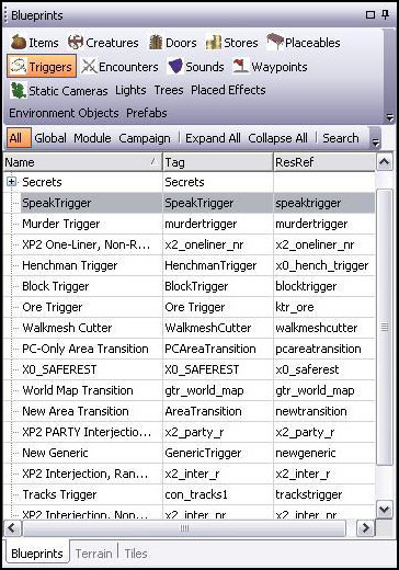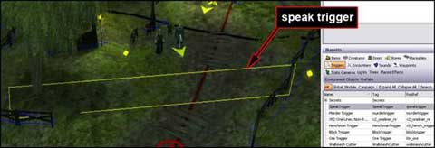 Traduzido por Nasher. Neste guia, você será apresentado aos triggers (gatilhos), e aprenderá a colocá-los no jogo. Você também ganhará um entendimento mais detalhado sobre dois tipos de triggers em particular: de diálogo e de transição de áreas. Conteúdo . O que é um Trigger? . Colocando um Speak Trigger . Triggers de Area Transition . Conclusão O que é um Trigger? Diferentemente da maioria dos objetos que são colocados no mundo do jogo, os triggers (gatilhos) normalmente são invisíveis aos jogadores. Eles agem da mesma forma que seu nome sugere – quando um personagem do jogador cruza a borda de um trigger, ele é disparado. Um trigger pode ativar um diálogo, disparar uma armadilha, ou criar uma gangue de monstros. Se você jogou o módulo de exemplo, Uninvited Guests, você já encontrou um trigger simples. Quando você se aproximou pela primeira vez de Pitney Lannon, seu personagem pisou em um speak trigger invisível. Esse trigger fez com que Pitney corresse em sua direção e abrisse sua janela de diálogo. O Toolset fornece uma seleção de triggers pré-criados para uso rápido e fácil. Modders mais avançados provavelmente farão uso extensivo do “generic” trigger, o qual pode ativar scripts próprios e é muito versátil. Para os propósitos deste tutorial, no entanto, focaremos em alguns dos triggers pré-criados. Colocando um Speak Trigger Um speak trigger (gatilho de diálogo) abre a janela de conversação e dispara um arquivo de diálogo. Para colocar um speak trigger no mundo, abra uma área do teu módulo. Depois, localize o painel “Blueprints” e selecione a tabela “Triggers”. Clique em “Speak Trigger”, e mova o ponteiro do teu mouse para dentro da área. Note que o ponteiro do mouse parece uma cruz ao invés de uma flecha. Você agora definirá as bordas de um novo Speak Trigger. Clique uma vez na área para determinar o primeiro canto do teu trigger. Depois, clique em outro ponto próximo – uma linha será desenhada, conectando os dois pontos. Clique em mais dois pontos para definir um quadrado ou um retângulo. Aperte F2 (ou clique com o botão direito uma vez) e o ponteiro do mouse voltará ao normal. Um trigger pode ter qualquer forma. Você pode determinar quantos cantos desejar, e o Toolset se ajustará de acordo com a forma do teu trigger.  | Uma vez estando o trigger criado, você poderá movê-lo pela área como qualquer outro placeable. Clique uma vez no trigger e arraste-o para aonde quiser. Tópico Avançado: Redefinindo Triggers Se você não gosta do formato atual de um trigger, você pode clicar com o botão direito nele e selecionar “Repaint Trigger” do menu. Isto faz com que o ponteiro do mouse volte a ser uma cruz. Assim que você clicar uma vez na área, o formato do seu antigo trigger desaparecerá, e você será capaz de criar um novo. Quando você redefine um trigger, quaisquer propriedades que você já tenha determinado permanecem inalteradas. Agora seu trigger está colocado no mundo. Mas você precisará determinar suas propriedades antes de fazê-lo ter algum efeito dentro do jogo. Comece selecionando seu trigger e então dê uma olhada no painel de propriedades. Primeiramente, certifique-se de que a tabela “Properties” está selecionada. Desça até a seção “Scripts”. Note que o Script OnEnter já está marcado com gtr_speak_node. Não altere ou delete este script – ele fornece a funcionalidade básica de um speak trigger. Na parte inferior da seção “Scripts” há uma linha chamada “Variables”. Clique no campo a direita de “Variables” e um botão de browse deverá aparecer. Clique nesse botão para abrir a janela de variáveis.  | Você deverá ver nove variáveis listadas na nova janela, marcadas de 0 a 8. Clique em cada uma delas para ver as configurações na janela da direita. Revisaremos as configurações mais importantes de cada variável: 1. NPC_Tag: Determina qual NPC iniciará o diálogo com o jogador. Coloque a tag deste personagem no campo “ValueString”. No módulo de exemplo, o ValueString está como 01_pitney, a qual é a tag de Pitney Lannon. 2. Conversation: O campo mais importante – seu trigger não fará nada se este campo for deixado em branco. Este campo especifica a tag do diálogo disparada pelo seu trigger. Coloque a tag de seu diálogo no campo ValueString. No módulo de exemplo, o ValueString está como 01_pitney, a qual é a tag do diálogo de Pitney. 3. Run: Determina se o NPC se aproximará de seu personagem quando o diálogo começar. Se você determinar o campo ValueInt como sendo 1, o NPC correrá até o seu personagem. Se você deixar o ValueInt como 0, o NPC andará. Se você deixar o ValueInt como -1, o NPC permanecerá onde ele se encontra. No módulo de exemplo, esta variável está marcada como 1, por isso Pitney correrá na direção do personagem do jogador ao mesmo tempo em que seu diálogo se inicia. 4. TalkNow: Determina se o diálogo começa antes do NPC se aproximar do seu personagem. Determine o valor 1 no campo ValueInt se você quer que o diálogo se inicie imediatamente. Determine o valor 0 se você não quer que o diálogo comece até que o NPC alcance seu personagem. No módulo de exemplo, esta variável está marcada como 0, por isso o diálogo de Pitney não será aberto até que ele alcance seu personagem. 5. MultiUse: Determina se o trigger será disparado toda vez que um personagem do jogador pisar nele ou se será disparado apenas uma vez por jogo. Determine o valor 1 se você quer que o trigger seja disparado toda vez que um personagem do jogador cruzar suas bordas. Se você deixar o ValueInt como 0, o trigger será disparado apenas uma vez. No módulo de exemplo, está variável está determinada como 0, fazendo com que Pitney apenas inicie seu diálogo na primeira vez que o jogador passar pelo speak trigger. Tópico Avançado: Speak Trigger e Combate CombatCutsceneSetup:Esta variável especial é útil quando um 